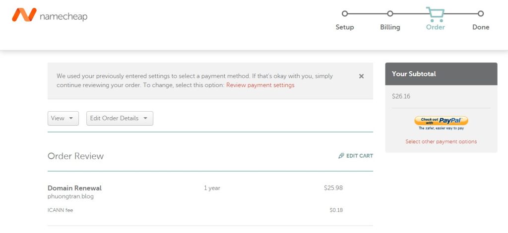 Tiếp là phần xác nhận phương thức thanh toán. Ở đây mình đã set từ trước là thanh toán qua Paypal. Nếu muốn thay đổi, bạn click chọn “Select other payment options”.